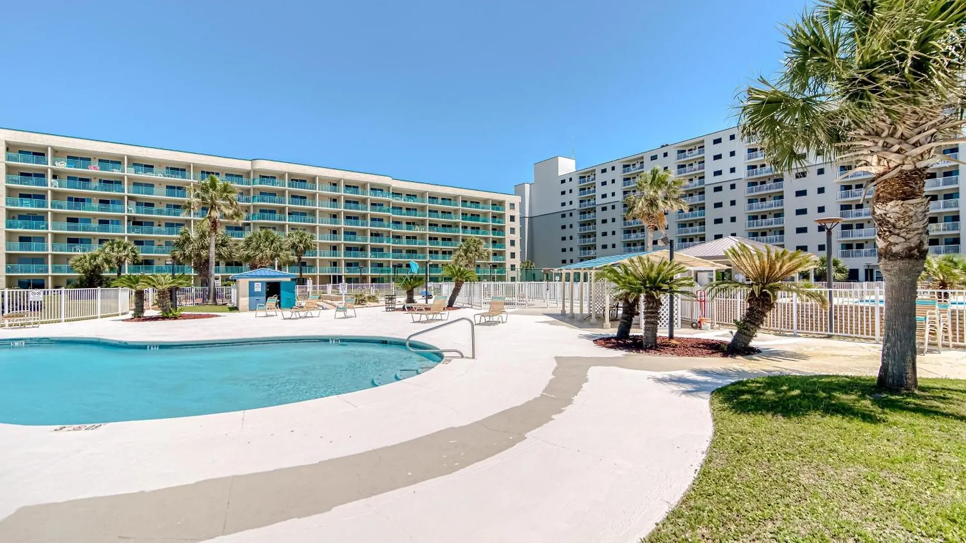 De 1-slaapkamer Gulf Shores Plantation-Palms 6508 villa heeft een buitenzwembad voor de ontspanning van de gasten en ligt op 5 minuten wandelen vanaf Kiva Dunes Golf Club.